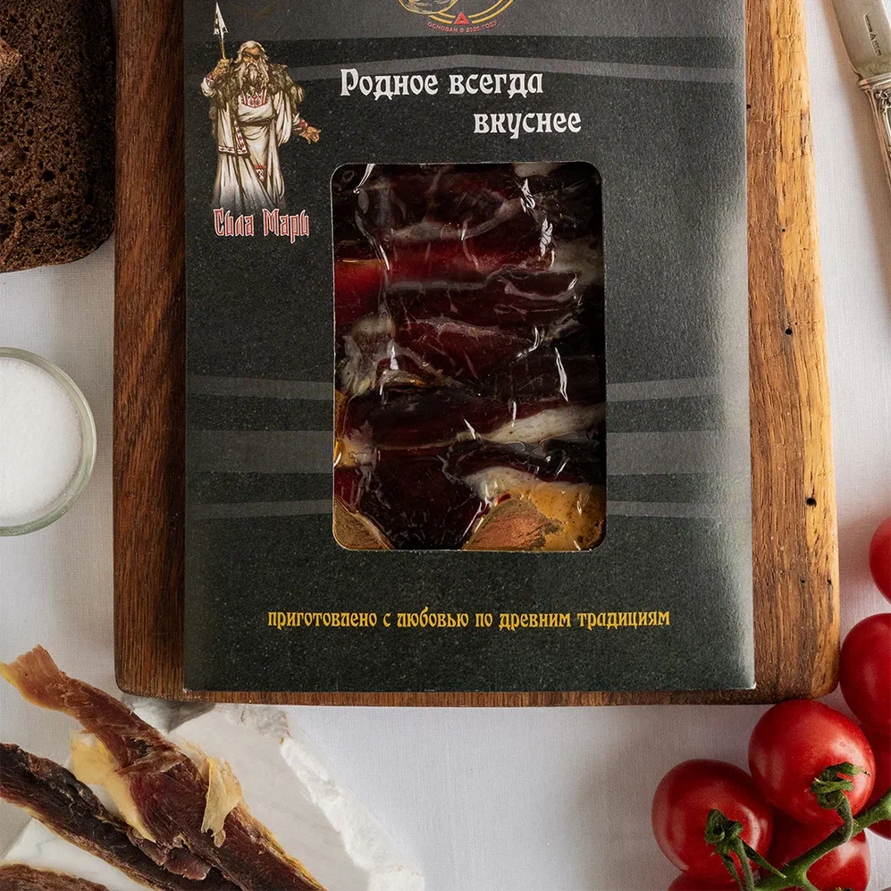 В нарезке — готовые тонкие слайсы с насыщенным вкусом дичи, дымком и благородной текстурой.