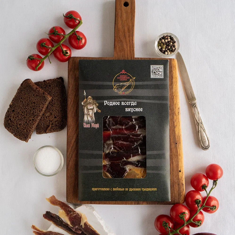 Нарезка окорока из дикого кабана «хамон» — деликатес российского производства, созданный по уникальной технологии провисания, традиционной для Руси. Это не испанский хамон, а провисной окорок, изготовленный из мяса дикого кабана, выращенного в заповедных районах Республики Марий Эл.