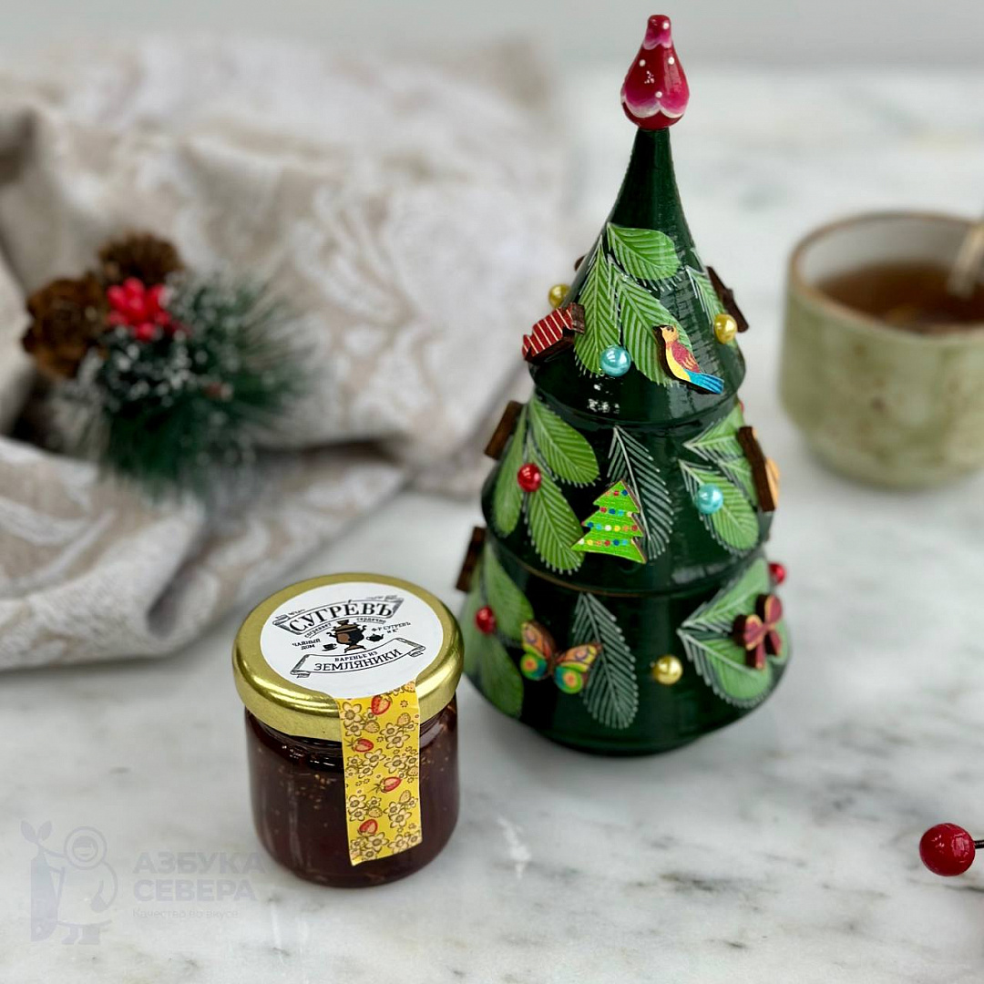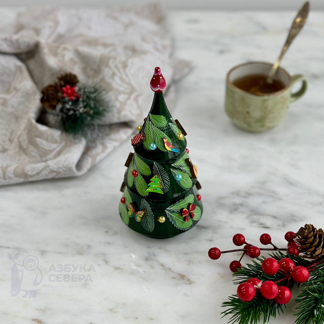 Ёлочка ручной работы из массива липы. Внутри нее спрятан тайник с мини-баночкой варенья из земляники, но вы можете положить туда любой другой сюрприз!