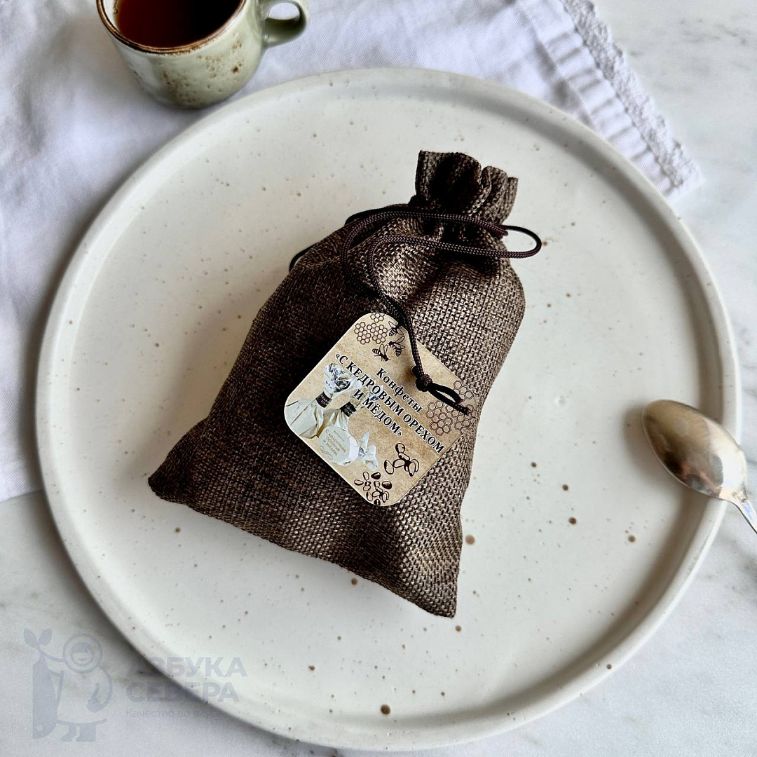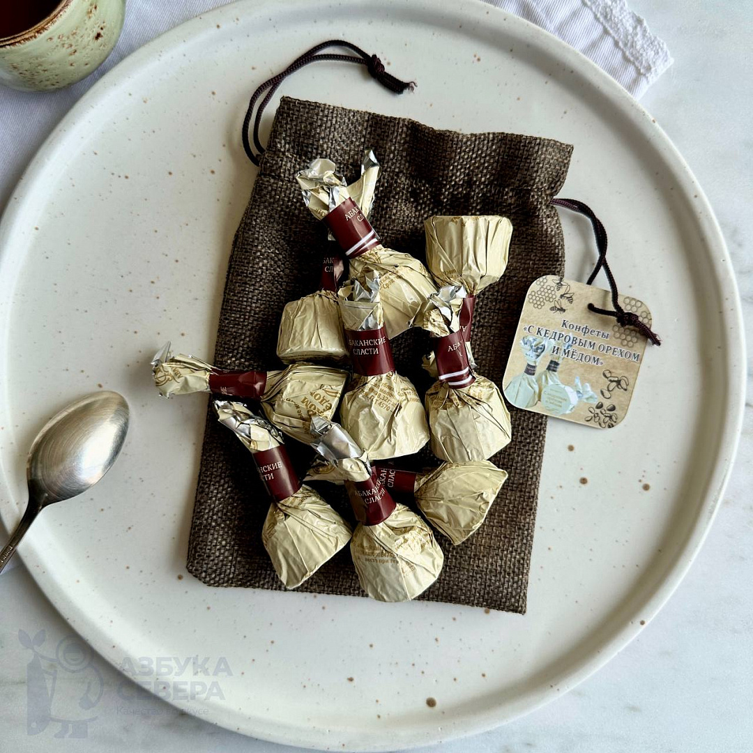 Конфеты из молочного шоколада, внутри ядра цельного кедрового ореха с медом. Каждая конфета упакована ручным способом в индивидуальную обертку.