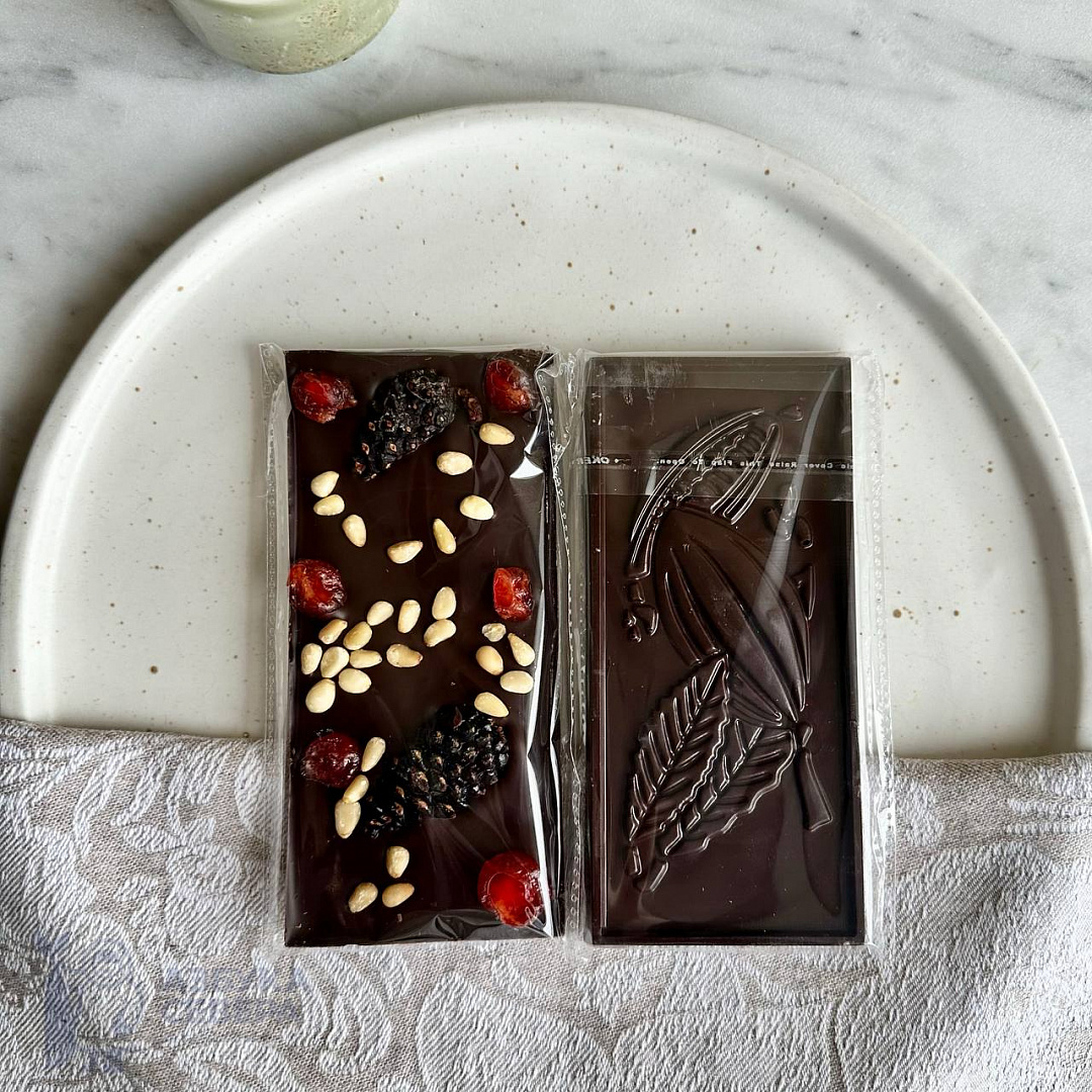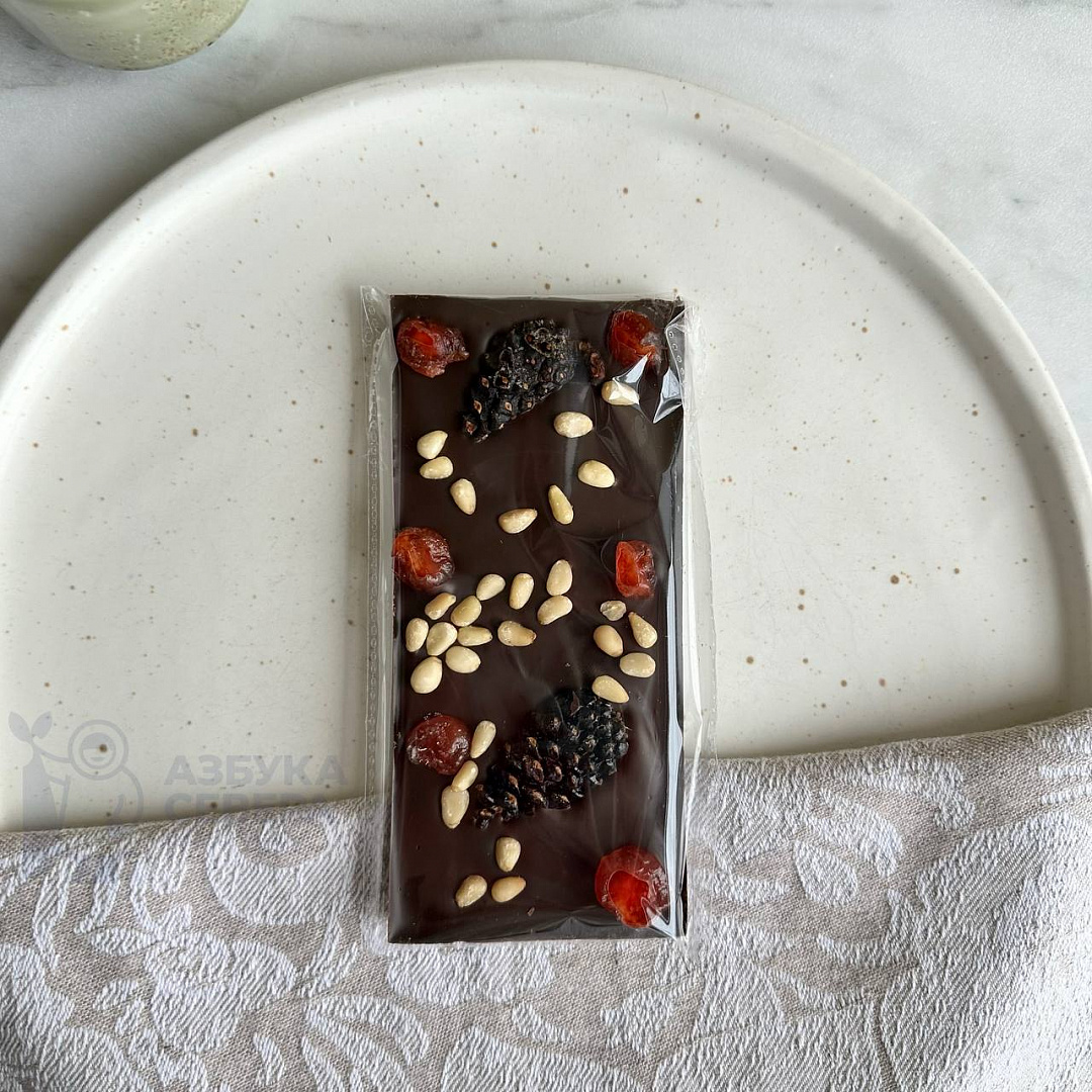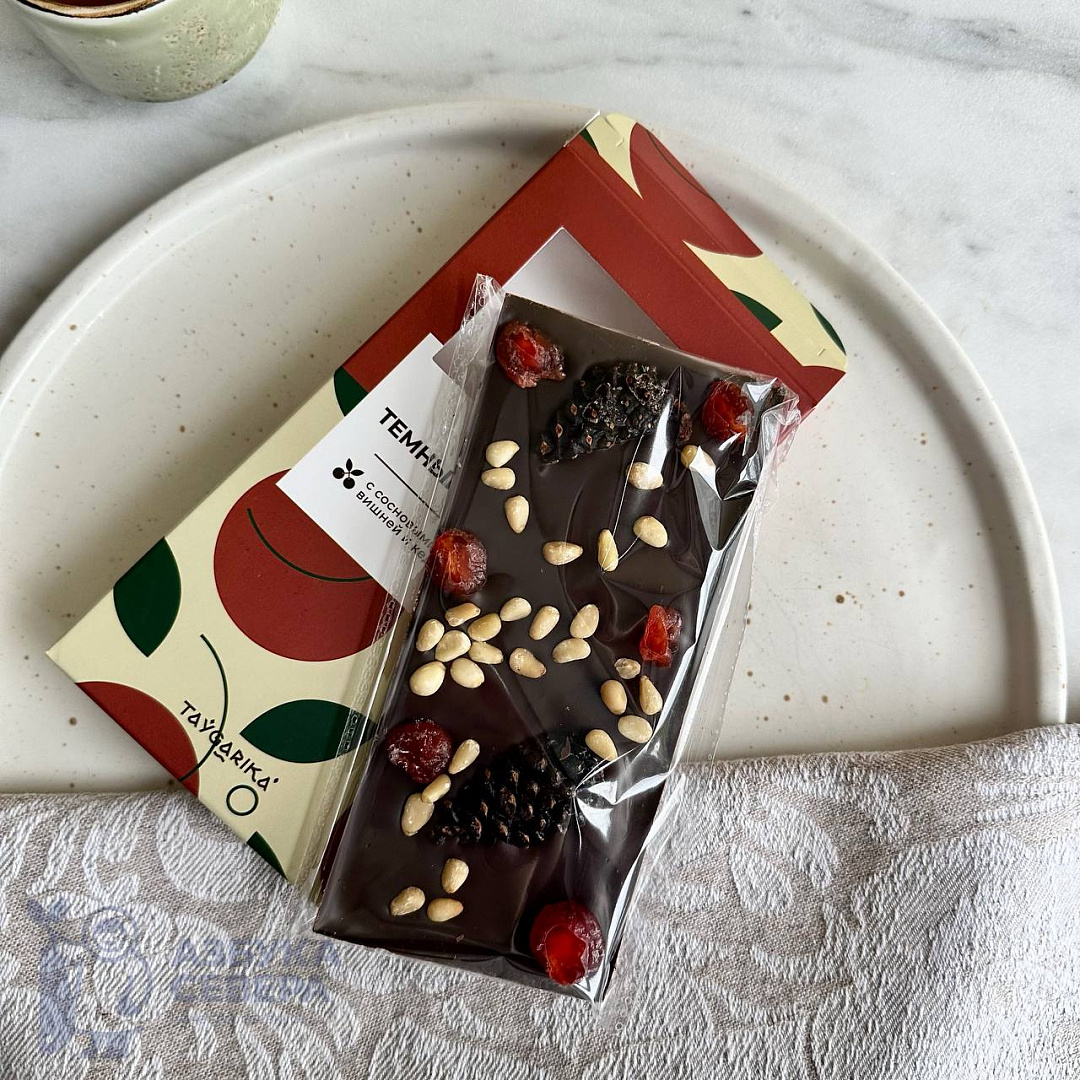 Шоколад темный с сосновыми шишками, вишней и кедровым орехом. Благородный тёмный шоколад, сладкая вяленая вишня – классика.Но когда их дополняет нежная ореховая нотка и долгое сосновое послевкусие, вот тогда-то и рождается идеальное лакомство с Таёжным мотивом. Хотите, отличиться и сделать необычный подарок? Тогда вам нужен именно этот шоколад!