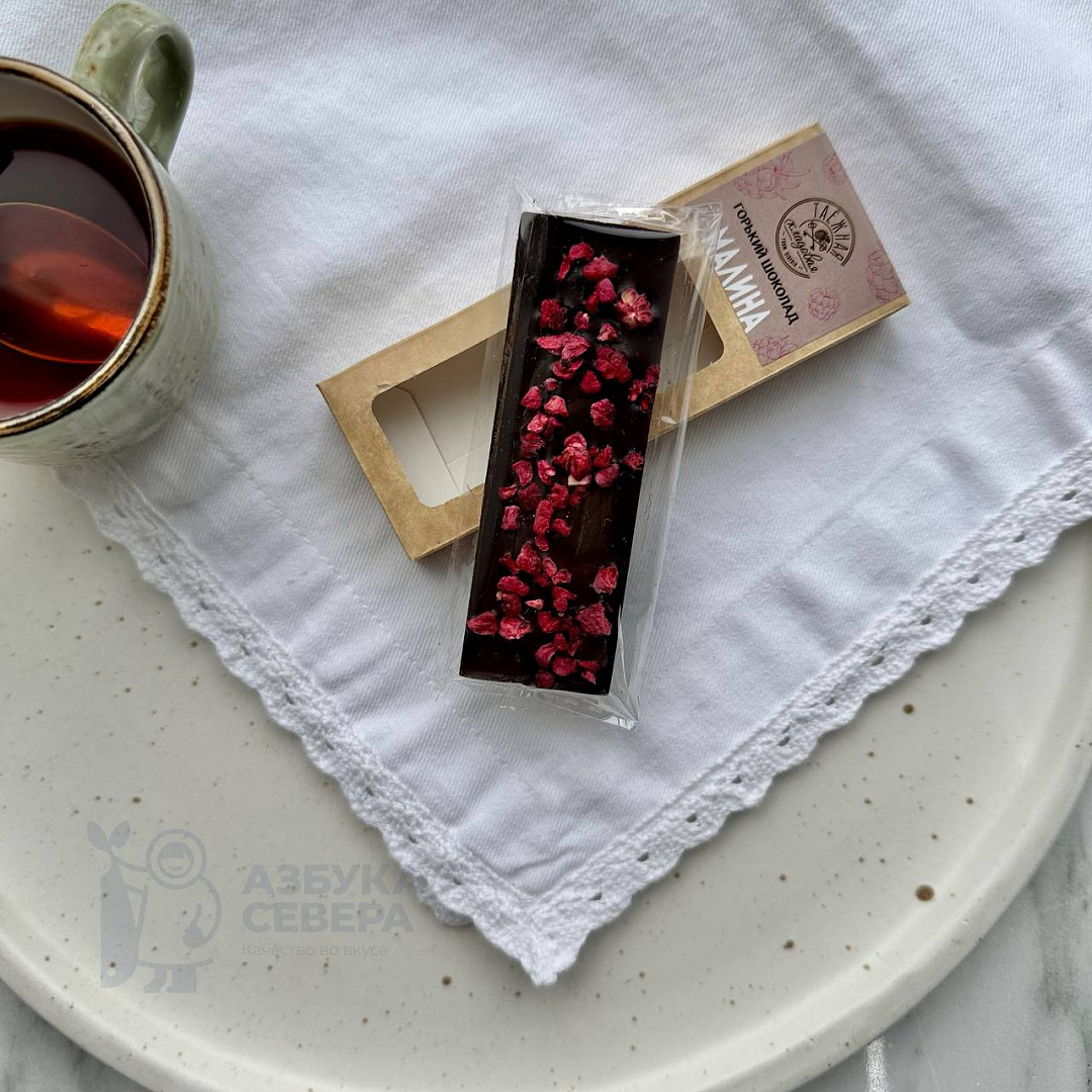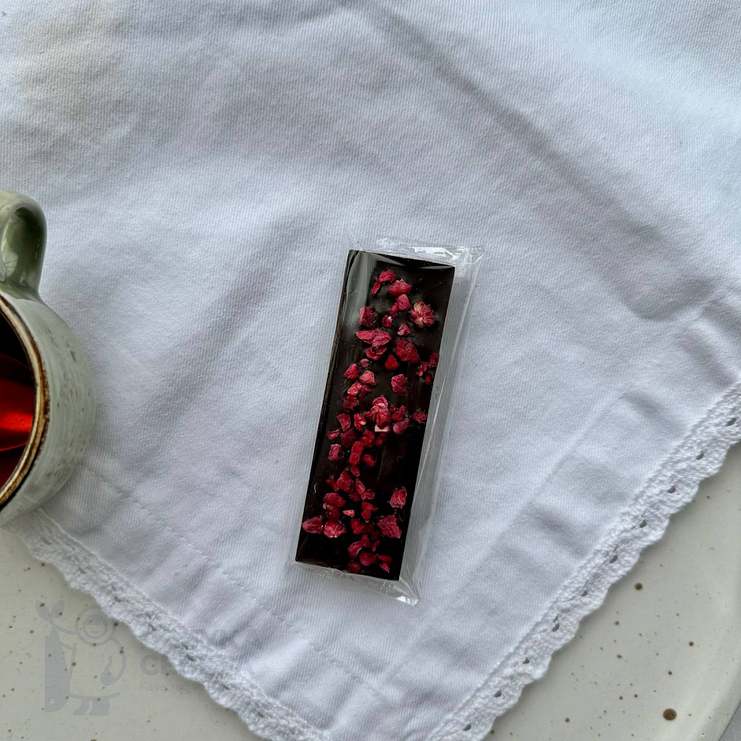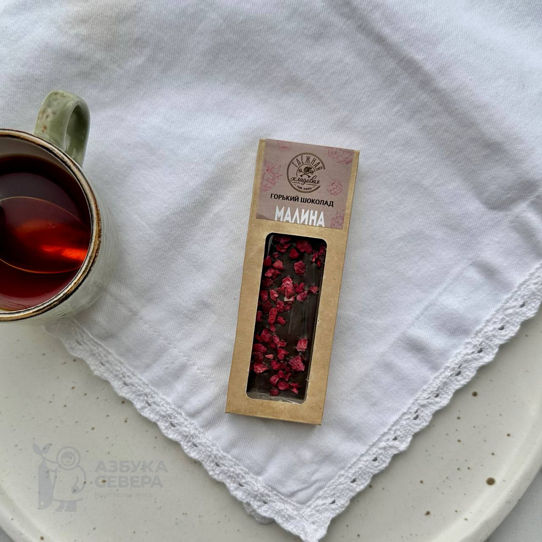 Плитка сочетает богатый вкус настоящего тёмного шоколада и лёгкие фруктовые нотки сублимированной малины. Такой дуэт порадует ценителей не приторных сладостей и станет маленькой паузой наслаждения среди дел. Продукт не содержит искусственных добавок, в составе — только натуральные ингредиенты.