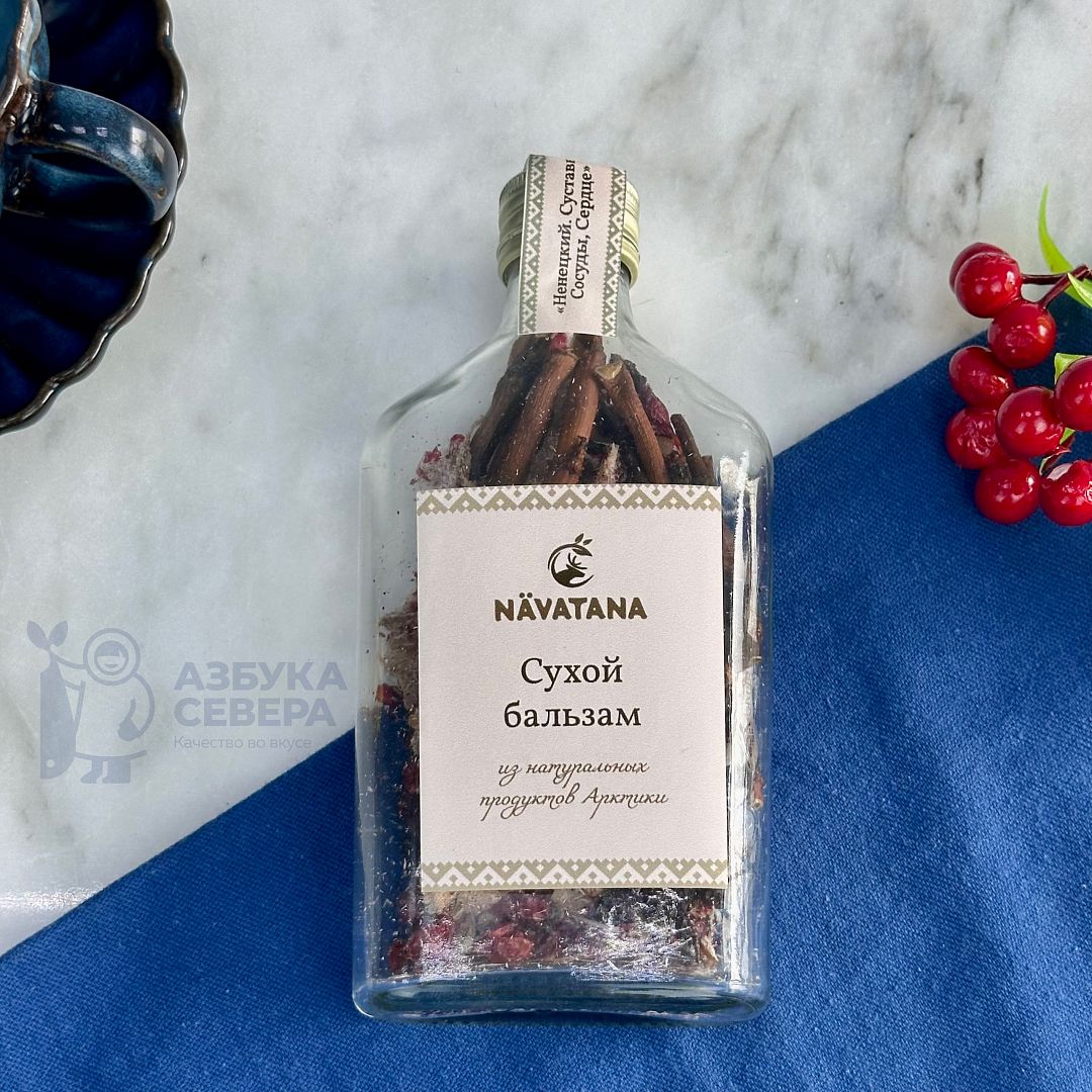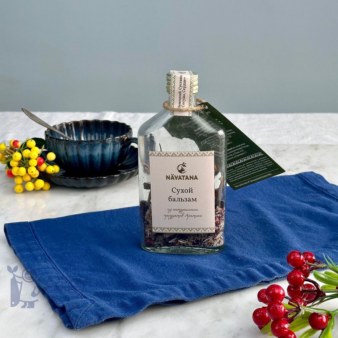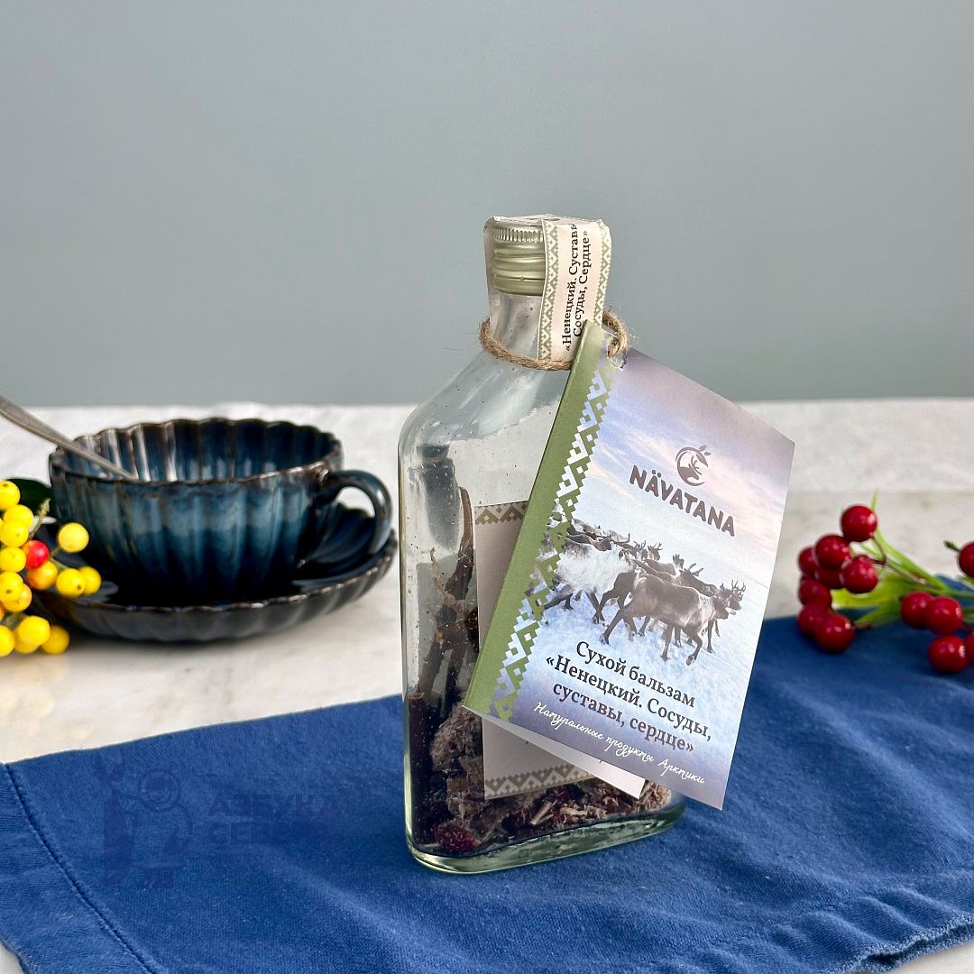 Бальзам «Ненецкий» — это собранные вручную компоненты, характерные для северных регионов: порошок из оленьих сухожилий, хвоста и рогов, сабельник, брусника, шиповник. Все ингредиенты высушены и измельчены по традиционной технологии, что сохраняет их насыщенный природный вкус и аромат.